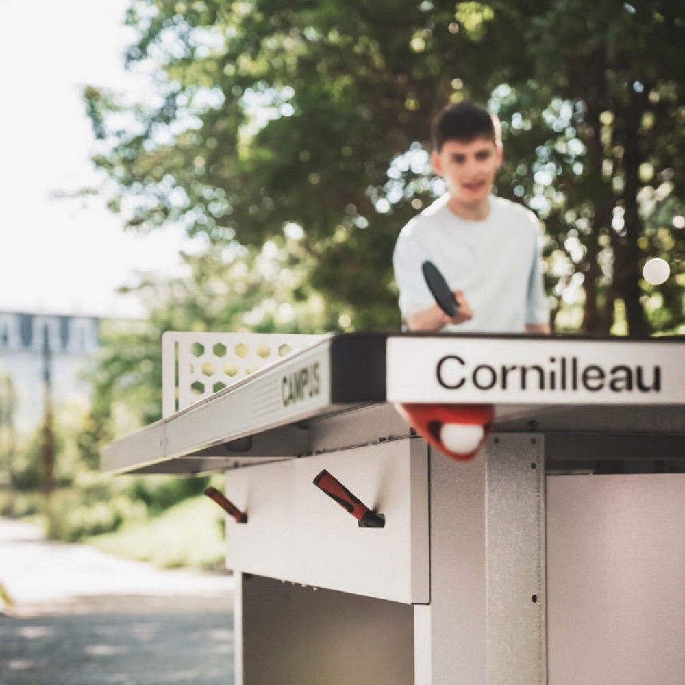 Cornilleau Campus kültéri pingpongasztalt kifejezetten intenzív igénybevételre tervezték olyan környezetekbe, mint iskolák, táborok, szállodák, parkok és egyéb nyilvános helyek. A mellékelt rögzítőkészlettel az asztal biztonságosan rögzíthető betonhoz vagy más kemény felülethez, így garantált a maximális stabilitás és biztonság.