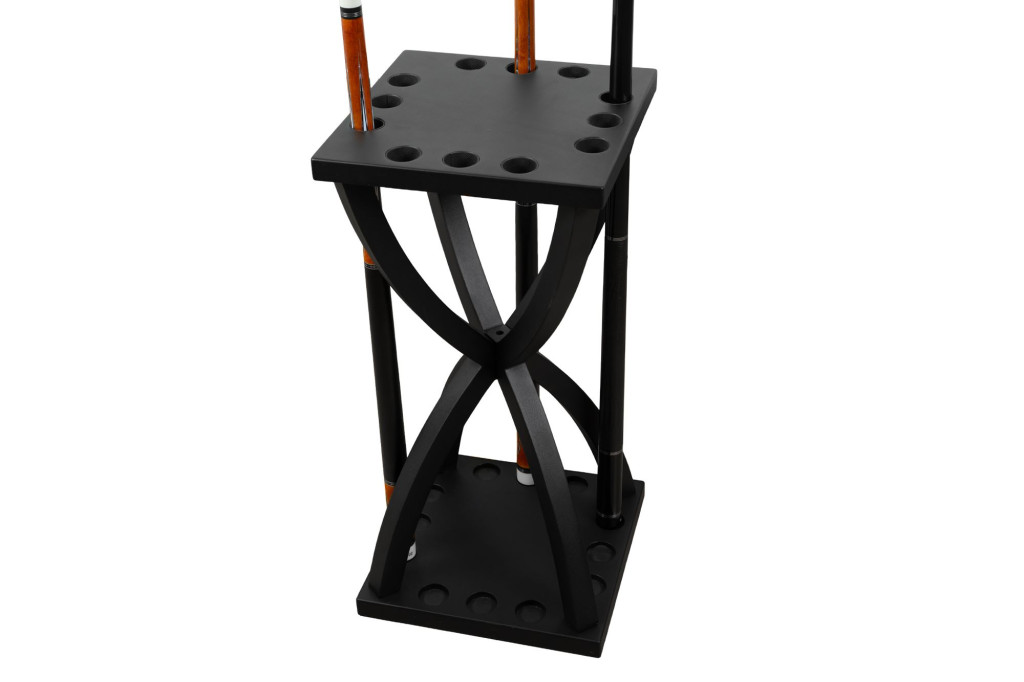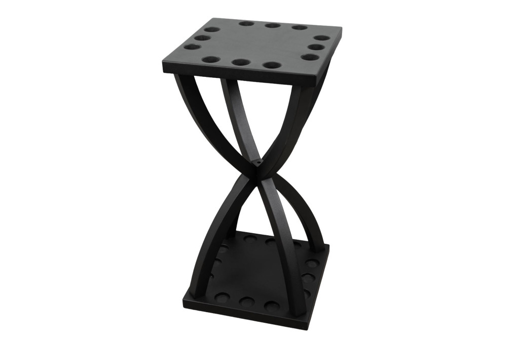 Cue Rack Vortex egy elegáns, fekete fémből készült biliárd dákóállvány, amely homokóra formájú kialakításával és letisztult vonalaival modern megjelenést kölcsönöz bármely helyiségnek. A 12 férőhelyes tároló biztonságosan tartja a dákókat, miközben megakadályozza a görbülést vagy sérülést. Az erős, X-alakú talp stabilitást biztosít, így az állvány megbízhatóan helyén marad, akár otthoni, akár professzionális környezetben használják.