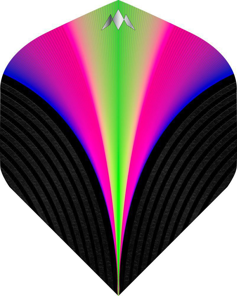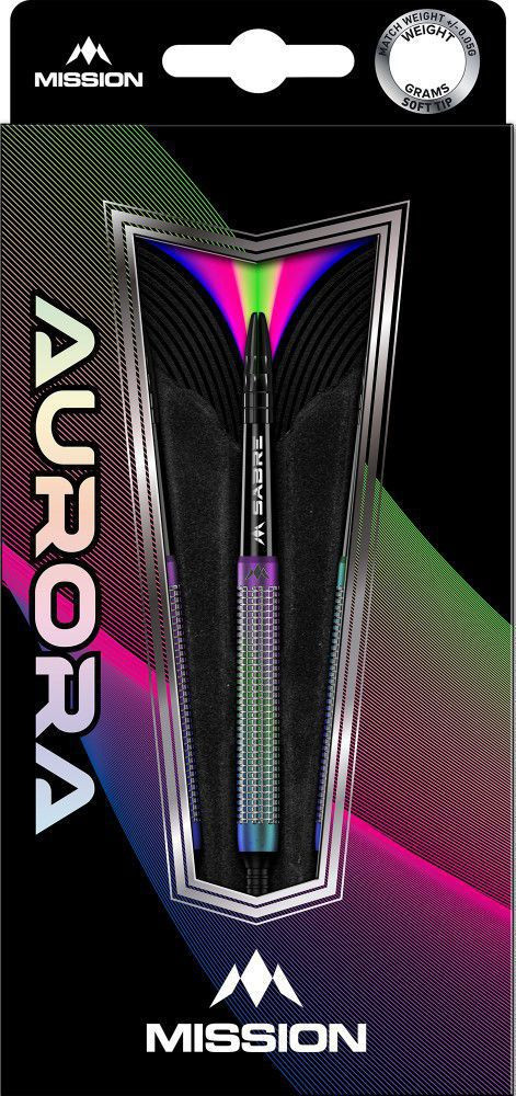 A darts szett Mission Aurora tollal van felszerelve, amely élénk és színes dizájnnal rendelkezik.