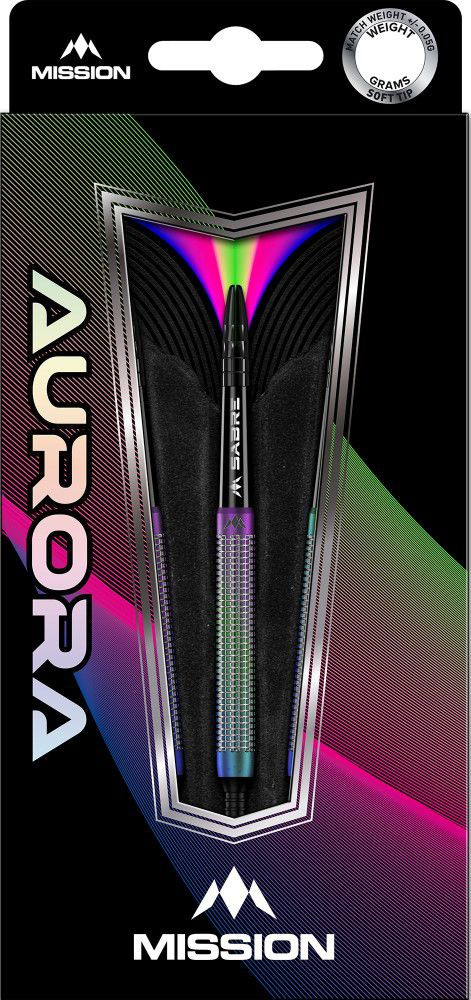 A darts szett Mission Aurora tollal van felszerelve, amely élénk és színes dizájnnal rendelkezik.