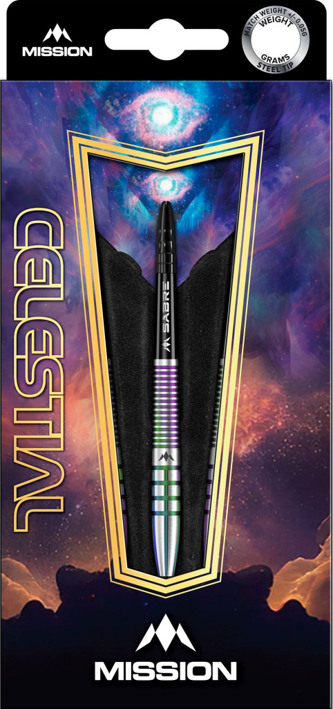 A Celestial darts fekete Mission Sabre szárral érkezik, amely szorosan tartja a tollat. A Mission Celestial toll látványos, űr témájú dizájnnal rendelkezik.