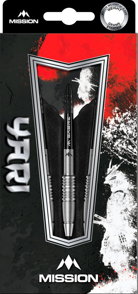 A Yari darts fekete hegyekkel, fekete Mission Sabre szárakkal és látványos szamuráj dizájnnal ellátott Mission Yari tollakkal érkezik.