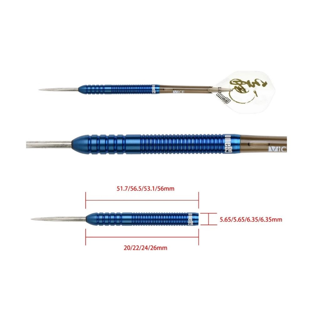 Kézzel készített extra vékony (5,6 mm) 90%-os wolfram tartalmúdarts készlet, kék titán-nitrid bevonattal.