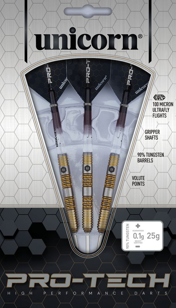 Az Unicorn Pro-Tech termékcsalád a darts legmagasabb szintjén való győzelemhez szükséges markolatot és formát ötvözi a legmodernebb technológiával, hogy a dartsokat új magasságokba röpítse.