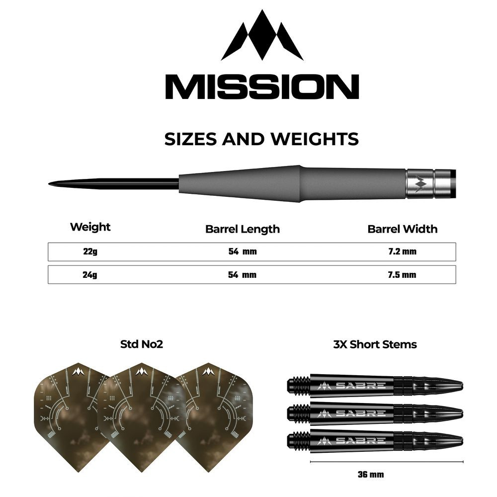 Zarándokolj a Mission Saturn Hyperion fémhegyű darts-szal! A Mission Saturn darts termékcsalád része, a Mission Saturn Hyperion 90% volfrámból és homokfúvott testből készült. A dart felülete teljesen sima, amelynek eleje egy elülső orrba kúposodik, amely fekete heggyel van kiegészítve. A dart hátrafelé egy természetes volfrám részre keskenyedik, a Mission logóval a hátsó részén. A test egy fekete Mission Sabre szárba vezet, amely szorosan a helyén tartja a Mission Saturn tollat.