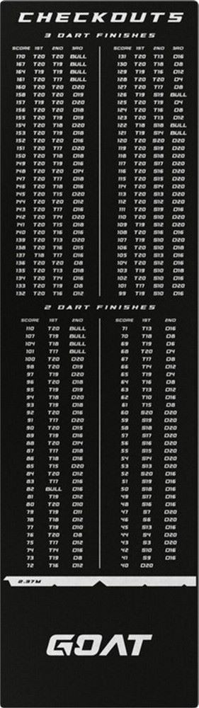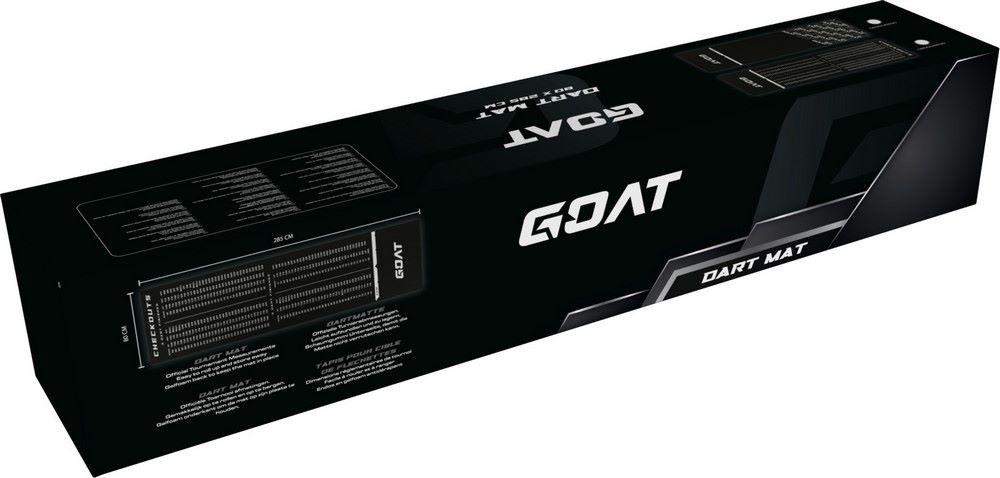 GOAT Checkout darts szőnyeg a tartósságot és a funkcionalitást ötvözi letisztult fekete dizájnnal és fehér nyomattal. A teljes