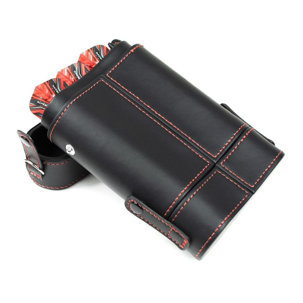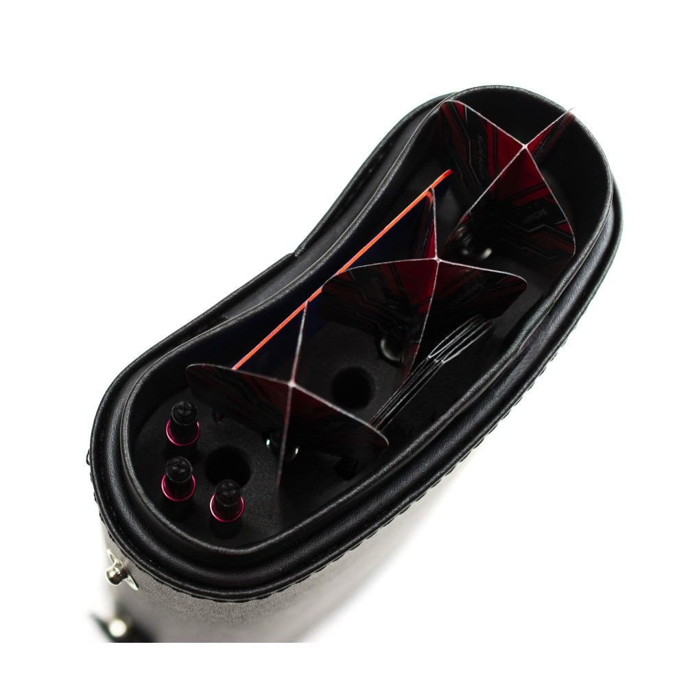 Két szett és kiegészítők tárolására alkalmas, csiptethető darts tok.