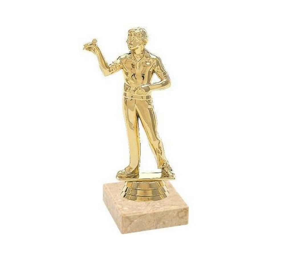 Elegáns darts trófea férfi játékos alakjával, arany színű figurával masszív márvány talpon. Ideális választás kluboknak, egyesületeknek és háziversenyek díjazására.