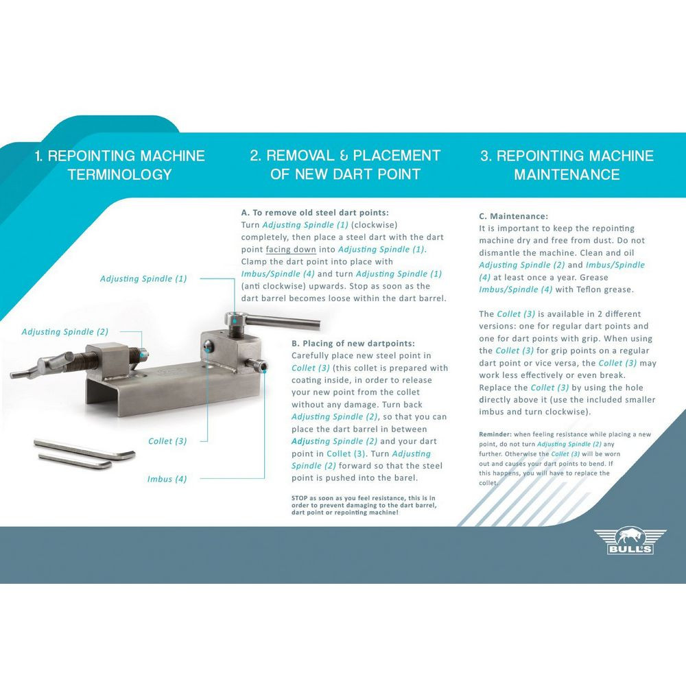 A Bull's Repointing Machine egy olyan eszköz, amelyet arra terveztek, hogy a fém darts hegyek cseréje gyerekjáték legyen. A darts-rajongók számára létfontosságú felszerelés. Ez a gép úgy készült, hogy könnyedén el lehessen vele távolítani a régi hegyeket és az új darts hegyeket is bele lehessen vele tenni a nyílba. A használhatóságot szem előtt tartva tervezték, ésszerűsíti a dars hegyek cseréjének folyamatát, egyszerűvé és hatékonnyá téve a fárasztó feladatot. A Bull's Repointing Machine egy, a standard hegyekhez való belső részt tartalmaz, amely kicserélhető egy kifejezetten a recés hegyekhez tervezett adapterre. Ez a rugalmasság lehetővé teszi a felhasználók számára, hogy testre szabhassák darts hegyeiket, akár hagyományos, akár recés dart hegyet használnak. A gépet sokoldalúsága és kényelme különbözteti meg a többiektől, ami biztosítja, hogy értékes kiegészítője legyen bármely darts-felszerelésnek. Érdemes azonban megjegyezni, hogy a Bull's Repointing Machine-nel való munka némi tapasztalatot igényel. Bár úgy tervezték, hogy könnyű legyen a használata, egy kezdőnek szüksége lehet némi időre, hogy hozzászokjon a gép funkcióihoz. Gyakorlással és türelemmel azonban a Bull's Repointing Machine a darts eszköztárának nélkülözhetetlen részévé válhat.