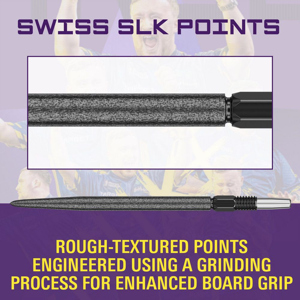 Swiss Point szabadalmaztatott zárrendszerének köszönhetően másodpercek alatt cserélhetők a dart hegyek. A kúpos és menetes technológia, valamint az egyedi kialakítású horony célja, hogy a játékosok könnyedén testre szabhassák nyilaikat – legyen szó stílusról vagy teljesítményről.
