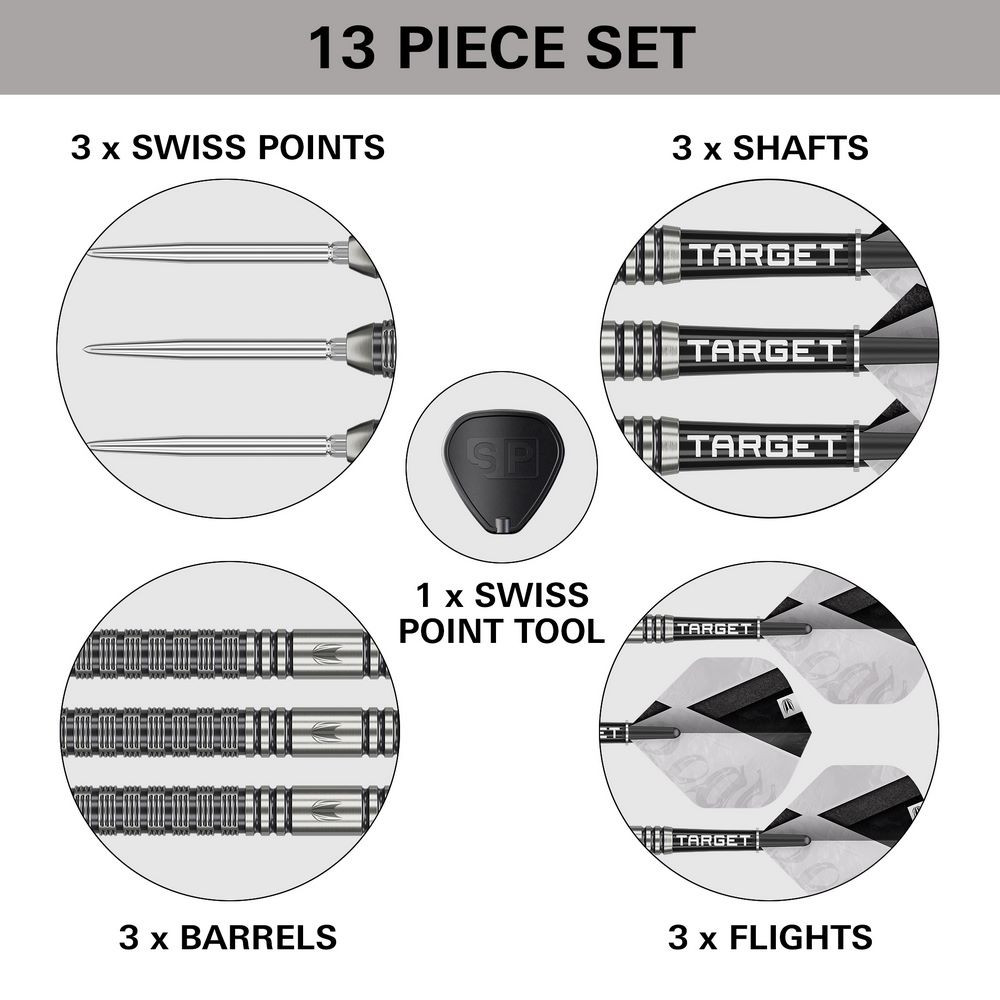 A csomagolás 3x teljesen felszeretl darts nyilat, továbbá egy Swiss Point csavaró kulcsot tartalmaz.