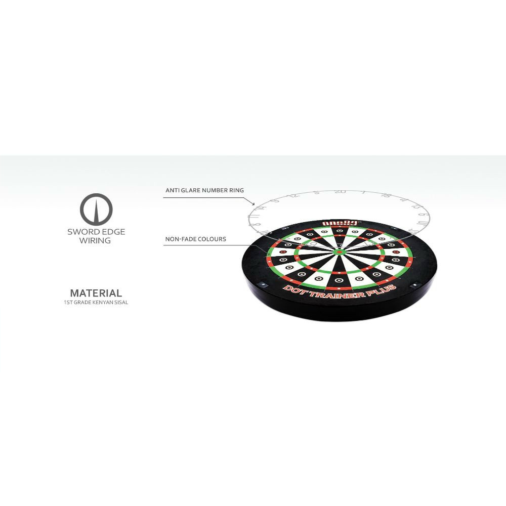 A One80 Dot trainer steel dart tábla bevezető szintű brazil sisal kender alapanyagú tábla. A különlegessége a szektorok közepén elhelyett pontok, körök amik abban segítenek a játékosnak, hogy a szektor közepére tudjon fókuszálni, és ez által célozni. A szegmensek és a bull drótja is élezett a hagyományos, gömbölyű fémdrótos megoldás helyett. Nincsenek lefogatások a bullnál, a dupláknál és tripla szektornál sem, a legkevesebb lepattanó nyíl érdekében. A dróthálóa tábla anyagába süllyesztve található, nem tud elmozdulni, mint az egyszerűbb kapcsos, lefogatású tábláknál.