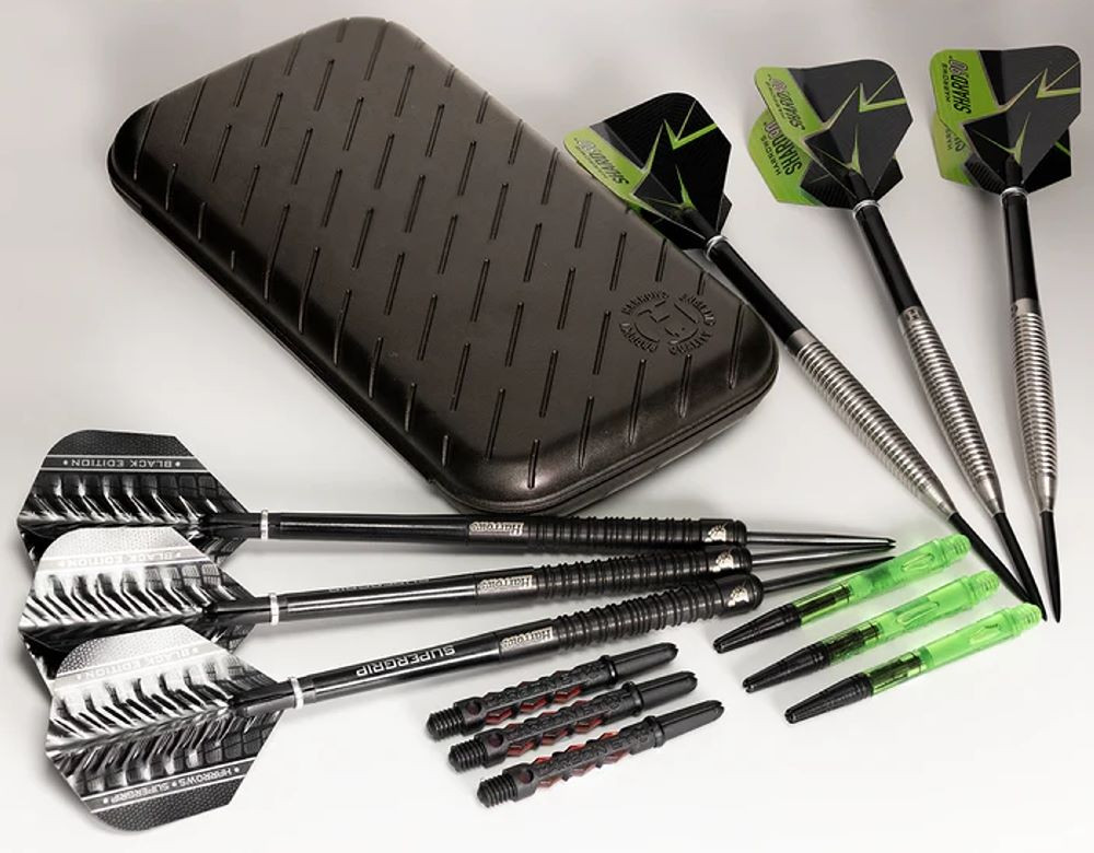 - 6 felszerelt darts nyilat, 2 szett extra szárat és 2 szett tollat tárol