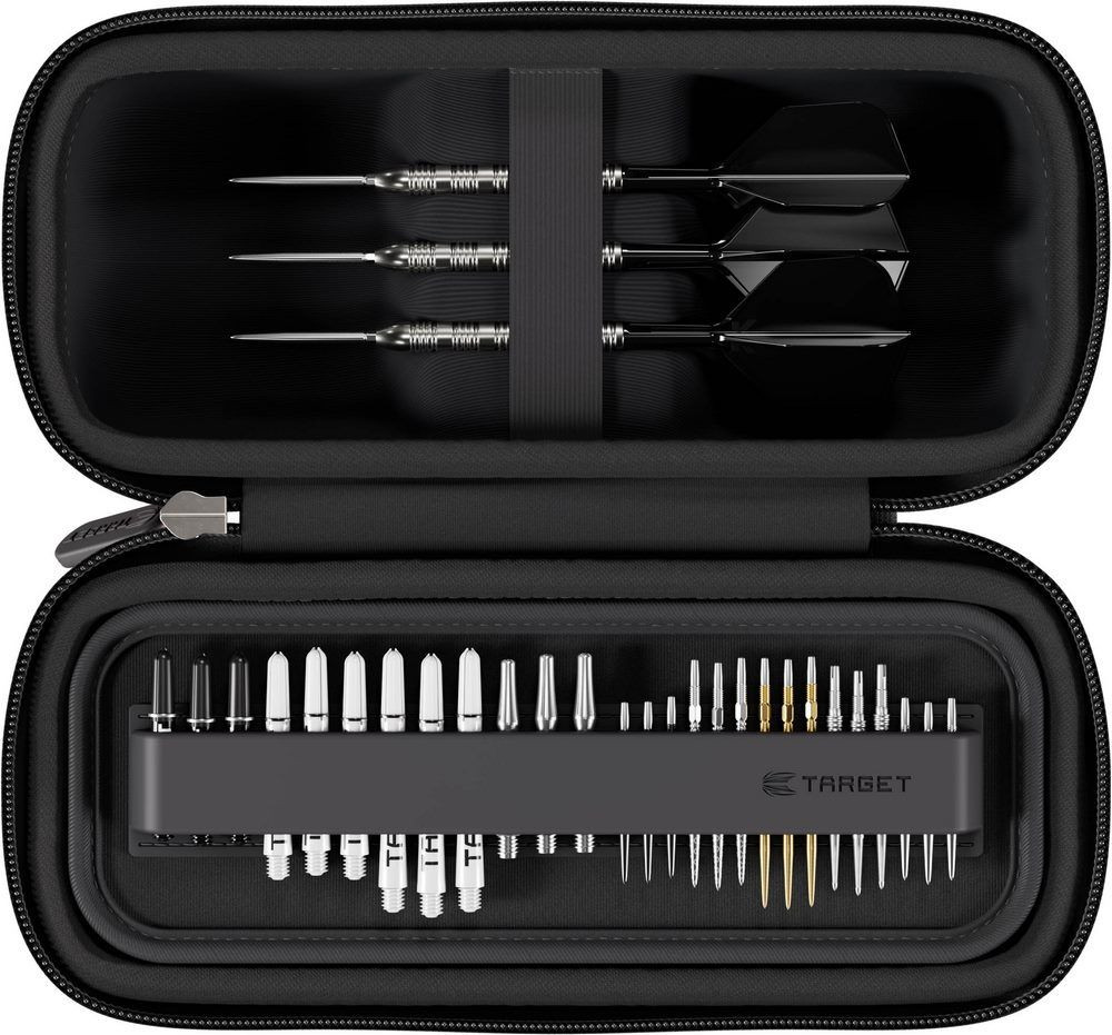 6 teljesen összeszerelt darts nyilat fogad (két szett), belső tálcarendszere pedig