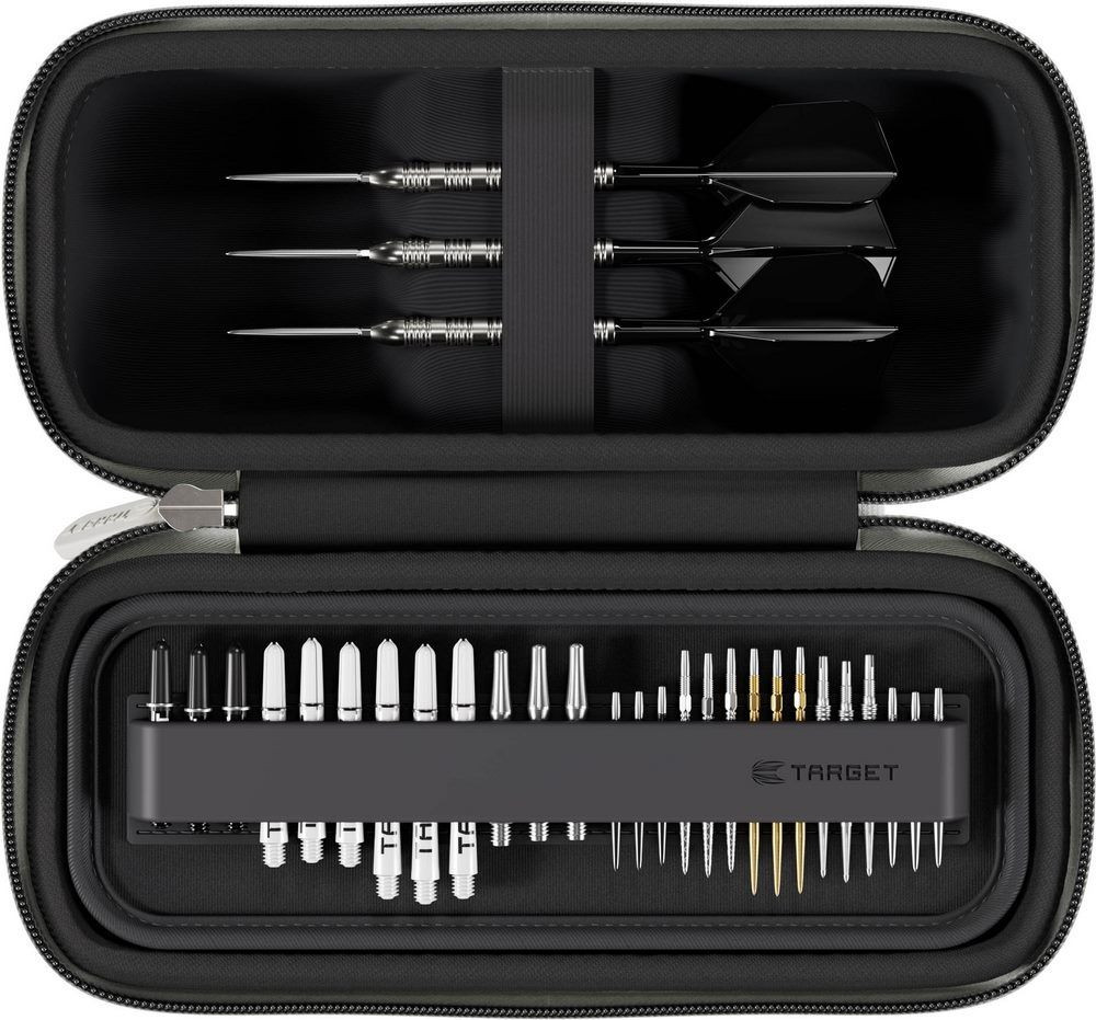 6 teljesen összeszerelt darts nyilat fogad (két szett), belső tálcarendszere pedig