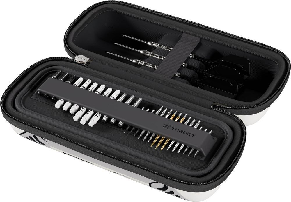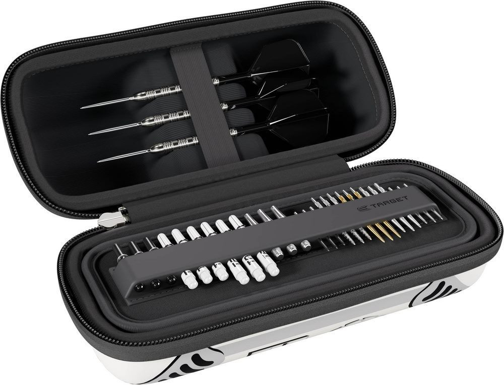 6 teljesen összeszerelt darts nyilat fogad (két szett), belső tálcarendszere pedig