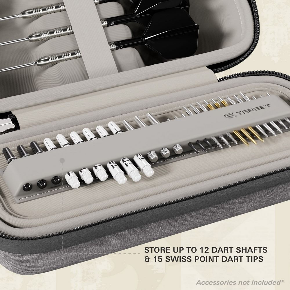 A tokban kényelmesen elfér akár 6 teljesen összeszerelt darts nyíl (azaz 2 szett), így nem kell szétszedned a felszerelésed két játék között. A belső tálcarendszer 12 szár és 15 Swiss Point fémhegy tárolására alkalmas, míg a további rekeszek helyet biztosítanak tollaknak, K-Flex kiegészítőknek, Swiss Point eszközöknek és más szükséges tartozékoknak.