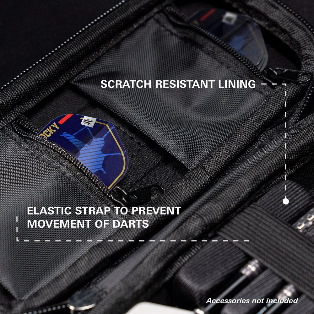 A tok hatékony rendezést biztosít két cipzáros zsebbel, amelyek dedikált helyet biztosítanak tartalék darts kiegészítőknek, mint például tollak, szárak, hegyek vagy egy Swiss Point szerszám, így könnyen hozzáférhetőek intenzív játékok során.