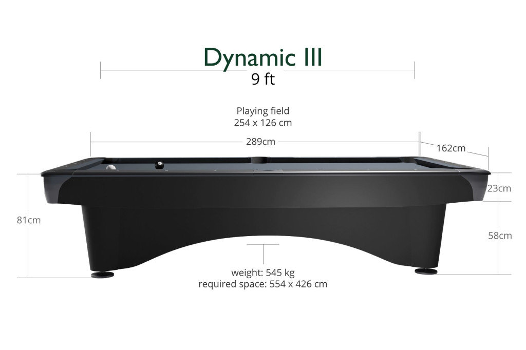 Tetszetős, modern dizájnjával a Dynamic III biliárdasztal (9 láb, fekete, matt felületű, Pool) tökéletesen illeszkedik a kereskedelmi játéktermekbe, valamint a privát biliárdtermekbe.