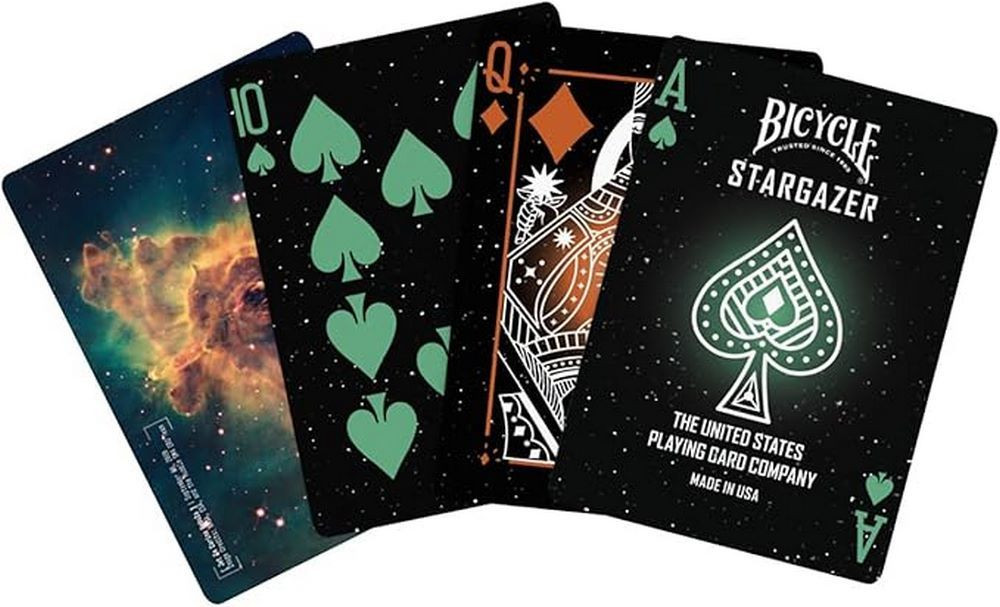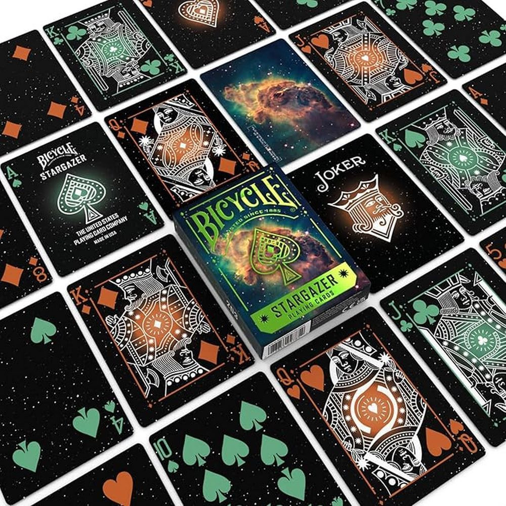 A Bicycle Stargazer 203 pakli a csillagászat csodáját hozza a kezedbe: a hátlap dizájnját a lenyűgöző Carina-köd alapján alkották, élénk narancs és kék árnyalatokkal. A zodiákusra, csillagképekre emlékeztető vonalak és égi motívumok mesés hangulatot árasztanak minden játék során.