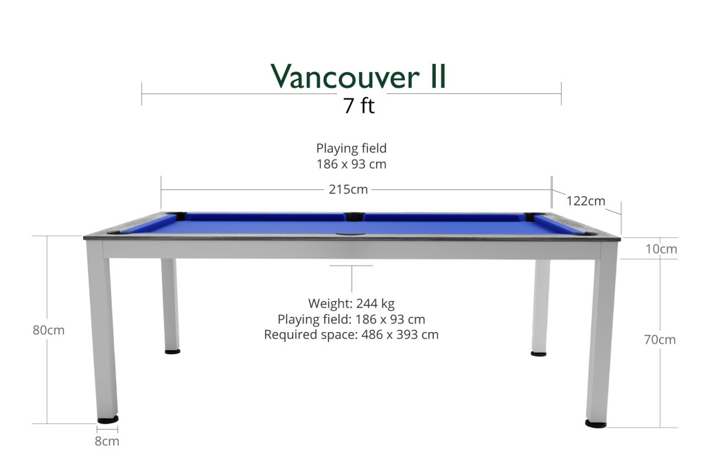 A pontos beállítás érdekében a Vancouver biliárd/vacsoraasztal állítható lábcsavarokkal rendelkezik. A K66 mandínerrel ellátott mandíner biztosítja a legjobb visszapattanásokat, és nagyfokú pontosságot tesz lehetővé a játékban. A tartós, könnyen tisztítható biliárdposztó optimális sebességet, sima felületet és hosszú élettartamot garantál. A lapos, nem feltűnő zsebrendszer csúcstechnológiás elasztikus nejlonhálóival képes megtartani a játék közben zsebbe rakott labdákat, és a golyók eltávolítása után visszanyeri eredeti lapos formáját. Két három golyó fér el benne.