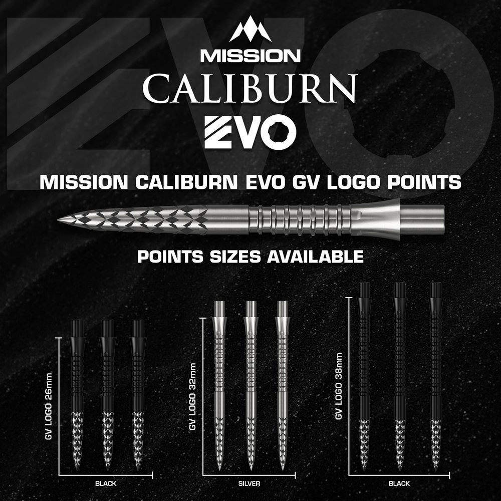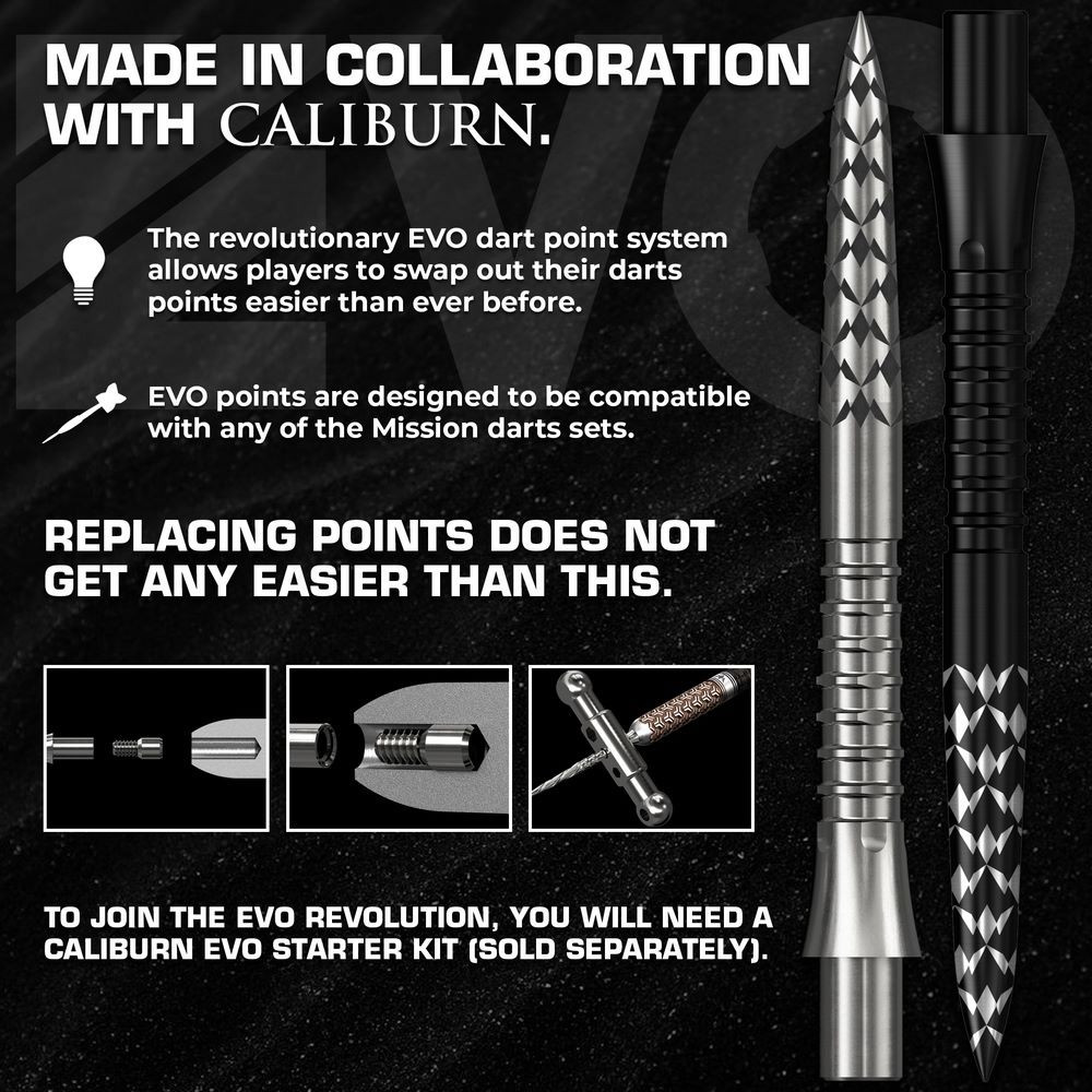 EVO darts hegy rendszerének köszönhetően a hegycsere minden eddiginél egyszerűbbé vált. A Mission a Caliburnnal közösen fejlesztette ki azokat a darts hegyeket, amelyek a