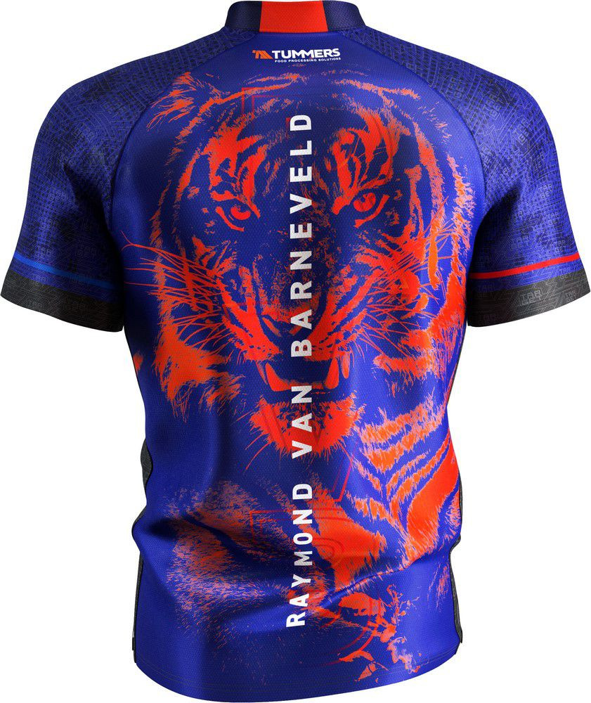 A dizájn öt merész narancssárga csillagot tartalmaz egy feltűnő lila, tigriscsíkos háttér előtt, ezzel szimbolizálva Raymond van Barneveld öt világbajnoki győzelmét. A hátoldalon egy narancssárga tigrisgrafika, melynek átható vörös szemei "Barney" ikonikus bevonuló dalára, az „Eye of the Tiger”-ra utalnak.