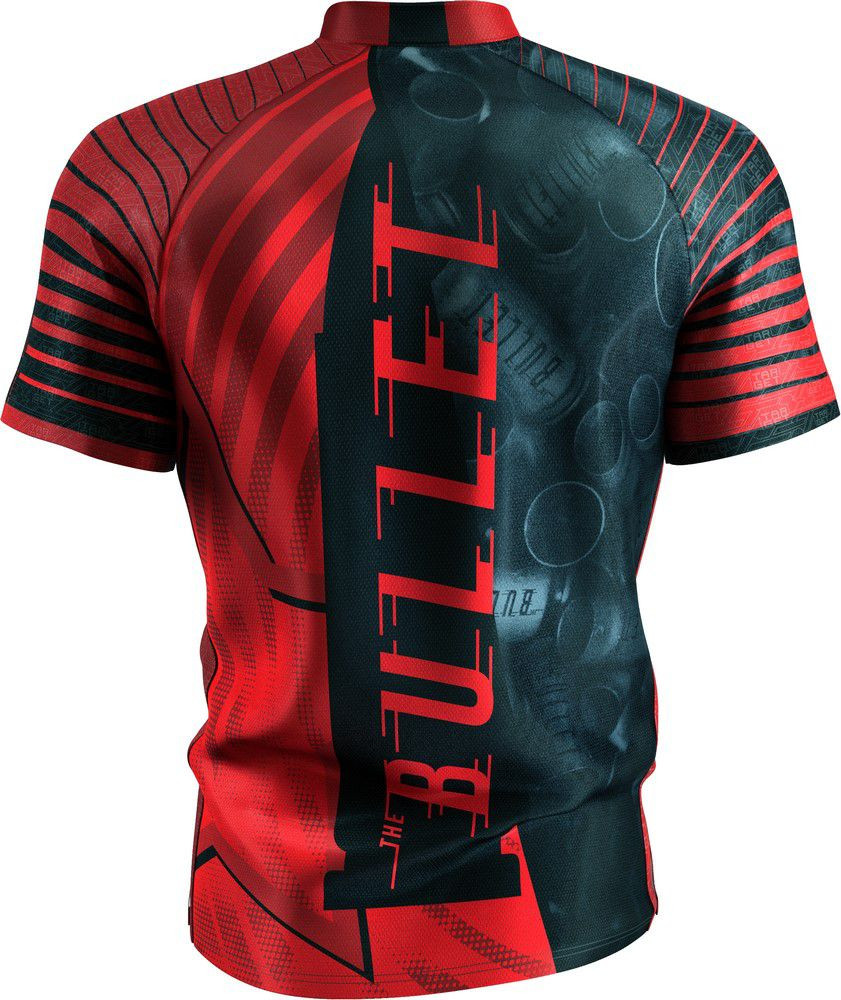 A póló merész, kéttónusú dizájnnal rendelkezik: egyik oldalán élénk piros színnel és egy csillaggal, amely a 2014-es világbajnoki győzelmét szimbolizálja. A másik oldal elegáns fekete, amelyen golyó grafikák találhatók, utalva dartsos becenevére. A hátoldalon nagy, piros betűkkel büszkén látható „The Bullet” felirat, amely olyan dinamikus és hatásos, mint Stephen Bunting jelenléte a dobóvonalon.