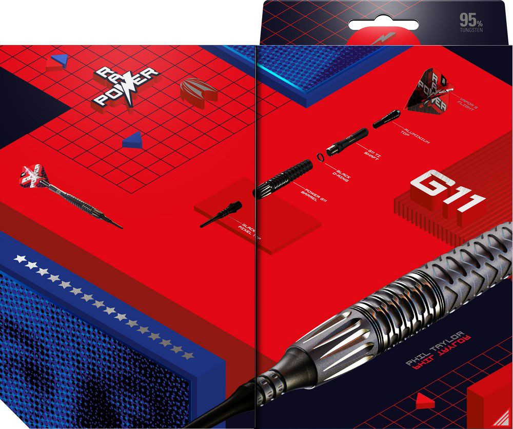 A Power 9Five Generation 11 Phil Taylor Raw Power darts, amelyet a 16-szoros világbajnokkal együttműködésben készítettek, az ő pontos követelményeinek és játékspecifikációinak megfelelően az utolsó versenyévében. A darts 95%-os nagy sűrűségű volfrám testtel rendelkezik, amely egyedülálló, precízen mart fogást kínál. A hordós alakú testet homokfúvással kezelik, majd fekete PVD bevonattal látják el, amely növeli a tartósságot és esztétikai megjelenését.