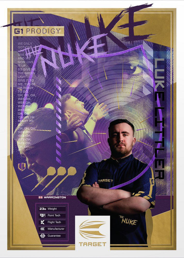 Bemutatjuk a Luke Littler Generation One, Prodigy Edition dartsot, amely lenyűgöző dizájnnal rendelkezik, aranyszínű díszítésekkel, amelyek eleganciát és exkluzivitást sugároznak, a gyűjthető kártyák világából merítve az inspirációt. A "The Nuke" közreműködésével készült, hogy megfeleljen az ő pontos követelményeinek és játékspecifikációinak.